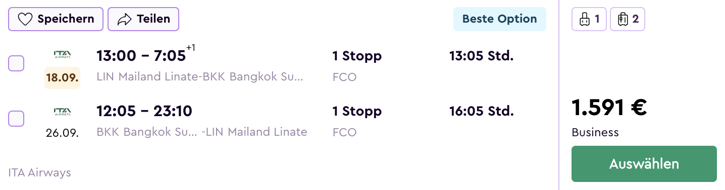 Die Flüge starten ab Mailand. Zunächst geht es mit ITA Airways nach Rom und anschließend weiter nach Bangkok. Ihr könnt das Angebot noch bis zum 18. Juli 2025 für Reisen im September und Oktober buchen.