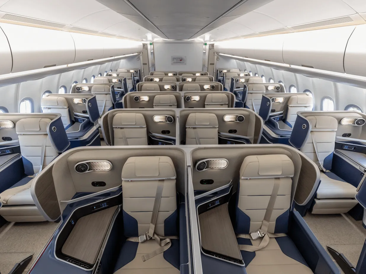 ITA Airways setzt nach Bangkok ihre Airbus A330neo ein. Hier findet man eine hochwerte Business Class Bestuhlung in einer versetzten 1-2-1 Konfiguration. Man genießt von jedem Platz direkten Gangzugang.