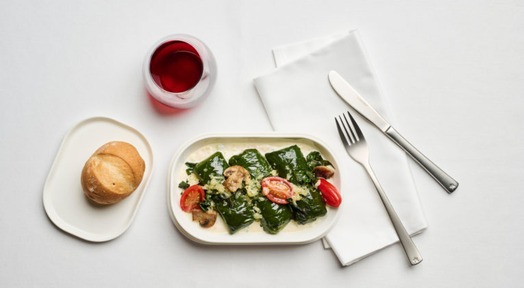In der Business Class stehen Capuns in feiner Käsesauce im Mittelpunkt – eine Spezialität aus Graubünden, bei der Mangoldblätter mit einer würzigen Füllung serviert werden.