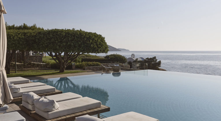 Unsere Zefiros Club Suite mit Privatpool liegt sehr zentral im Resort, praktisch neben einem der Polls und dem Club House, und überzeugt mit einem wunderschönen Meerblick.