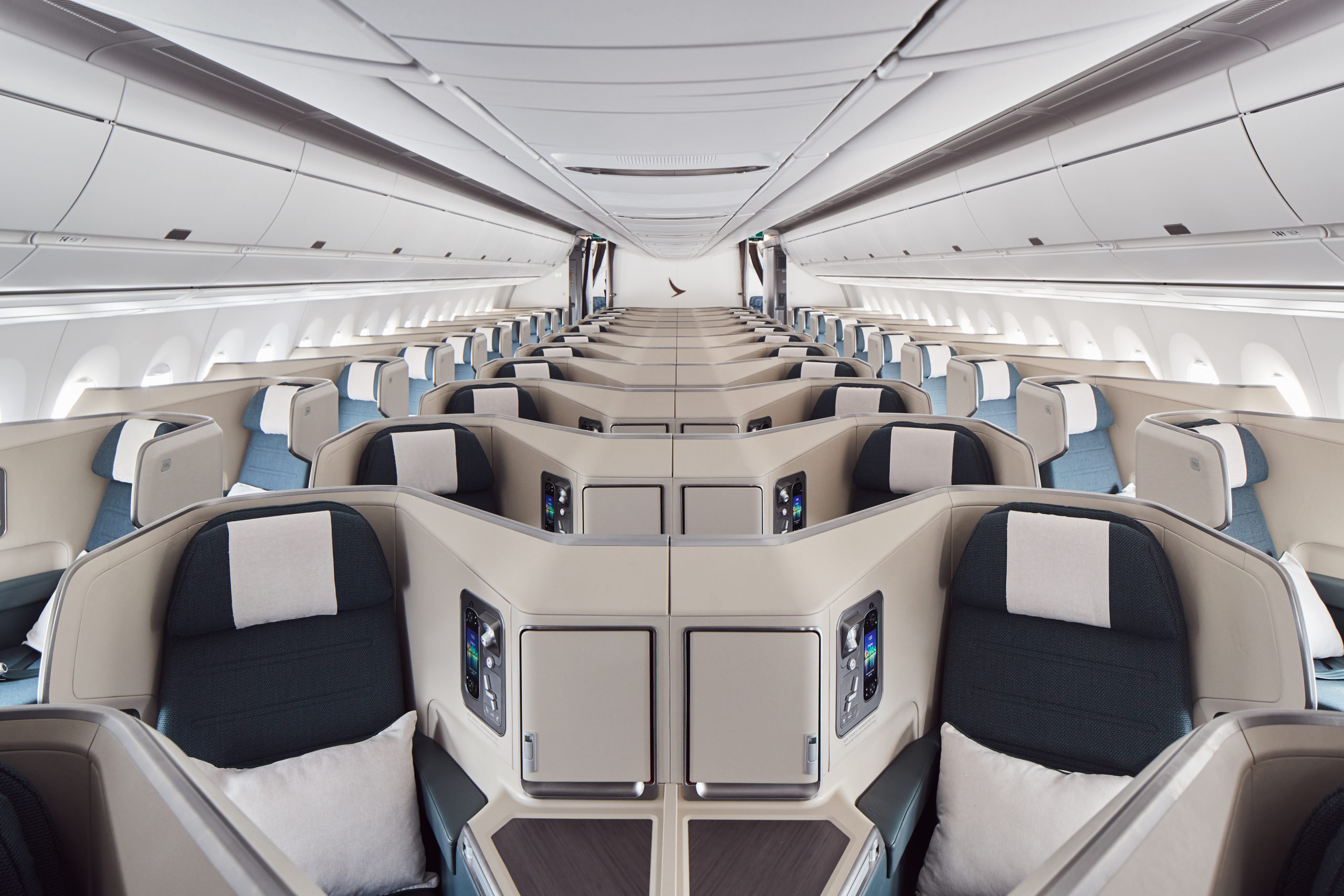 Cathay Pacific hat an Bord ihrer Airbus A350 ein modernes 1-2-1 Lie-Flat Business Class Produkt verbaut. Leider handelt es sich hierbei nicht um die neuen Aria Suites, dennoch können sich Gäste auf ein höchst komfortables Flugerlebnis freuen.