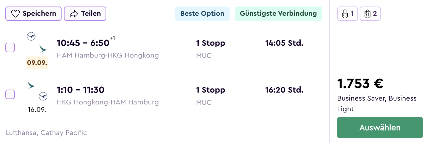 Wichtig zu erwähnen ist, dass ihr das Angebot nicht direkt ab Frankfurt oder München buchen könnt. Hier kosten die Flüge einige hundert Euro mehr. Sucht ihr jedoch ab beispielsweise Hamburg, Berlin, Stuttgart oder Düsseldorf, werden Euch die günstigen Business Class Flüge nach Hongkong angezeigt.