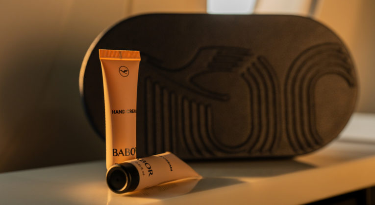 In der Lufthansa Business Class gibt es ab Mai neue Amenity Kits mit Produkten aus der „Soul & Body“-Linie von BABOR, darunter Lippenbalsam und Handcreme. Es ist schlicht, aber hochwertig und ideal für lange Flüge.