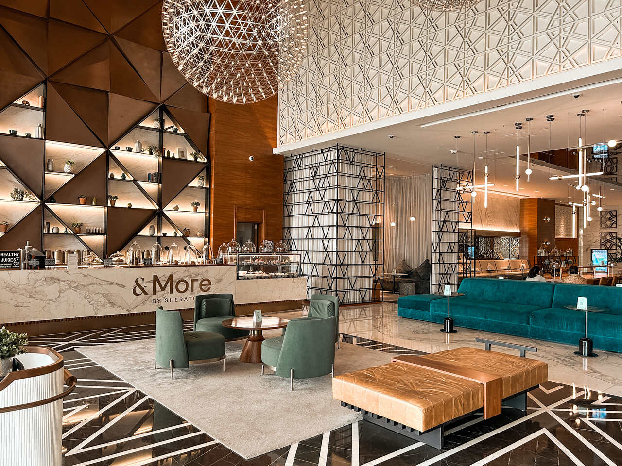 Die als „Public Square“ neu gestaltete Hotellobby bietet einen stilvollen, warmen und einladenden Raum, sei es beim Arbeiten, bei Meetings oder bei einem entspannten Kaffee. Tatsächlich ist die Hotellobby und das dazugehörige &More by Sheraton Cafe immer sehr gut frequentiert.