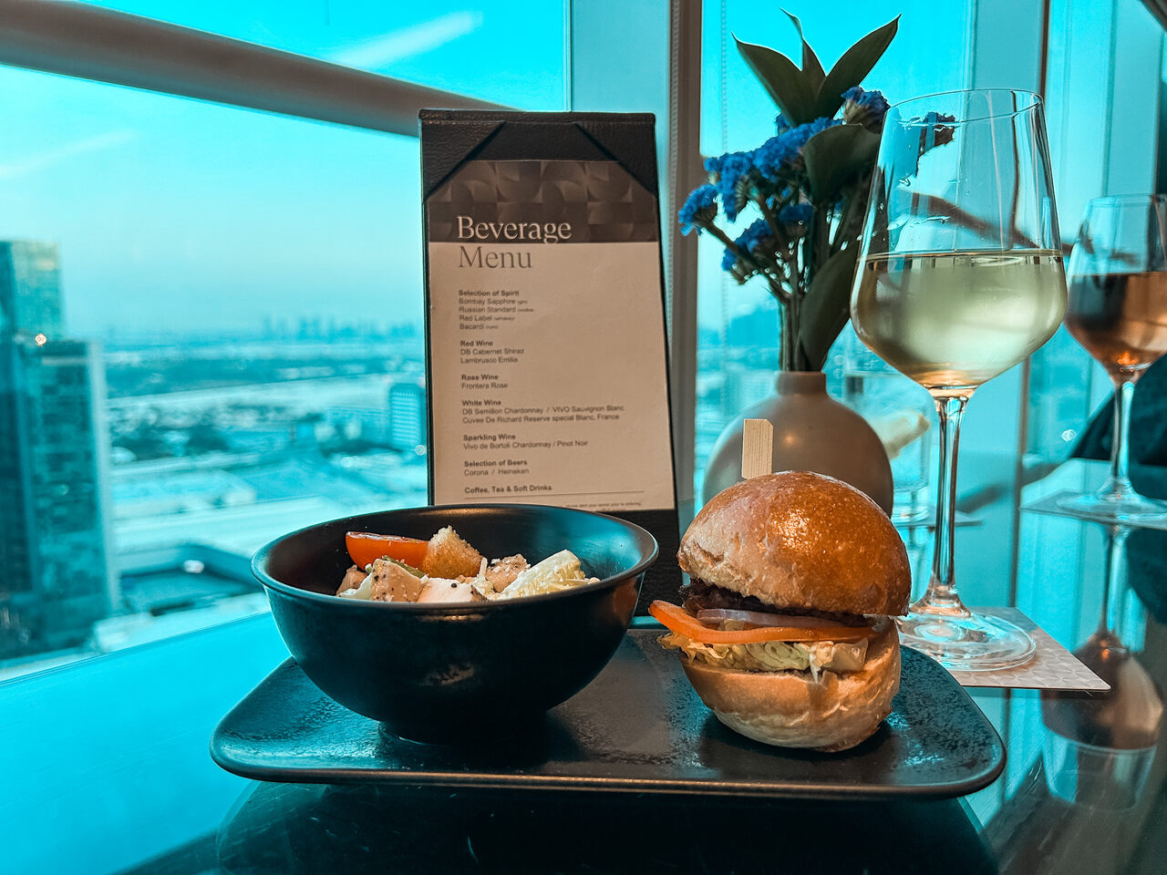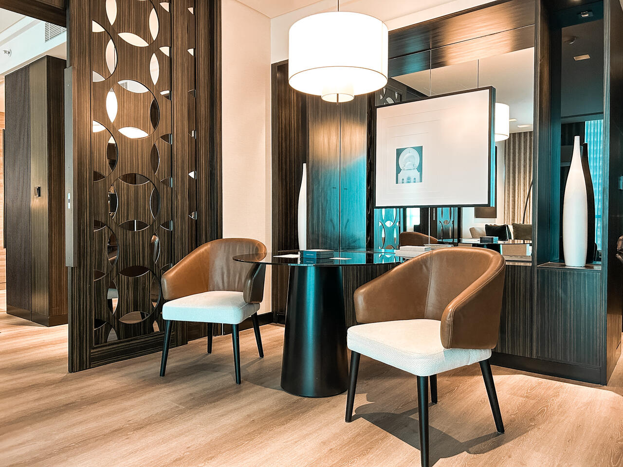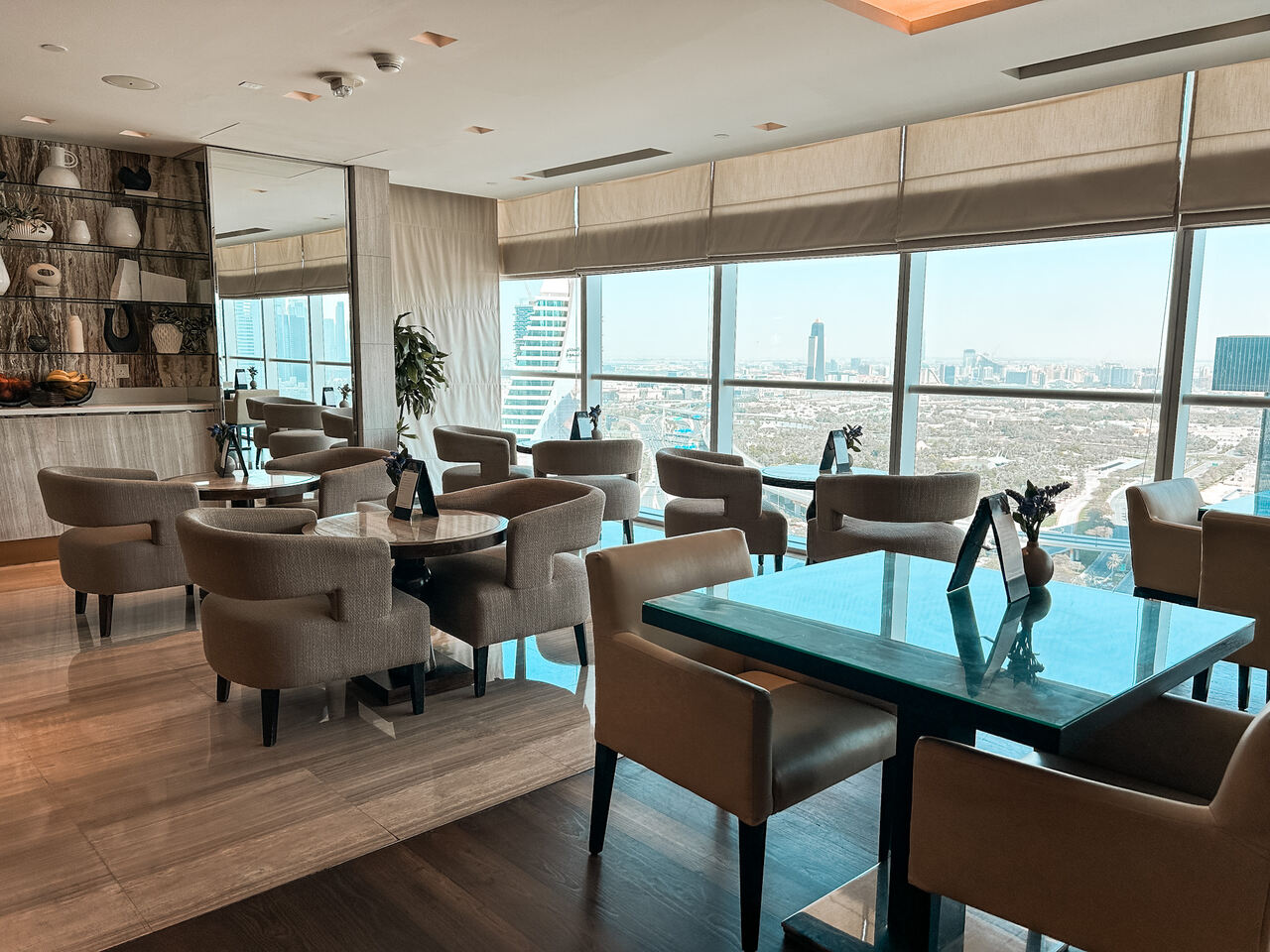 Diese befindet sich auf der 31. Etage und ist ein sehr angenehmer, privater Rückzugsort. Die Lounge hat einen Bereich mit hauptsächlich Sesseln sowie einen Bereich mit regulären Tischen und einem langen Community-Table. Ähnlich wie von der Grand Deluxe Suite aus blickt man auf die Sheikh Zayed Road, was gerade abends bzw. zum Sonnenuntergang immer beeindruckend ist.