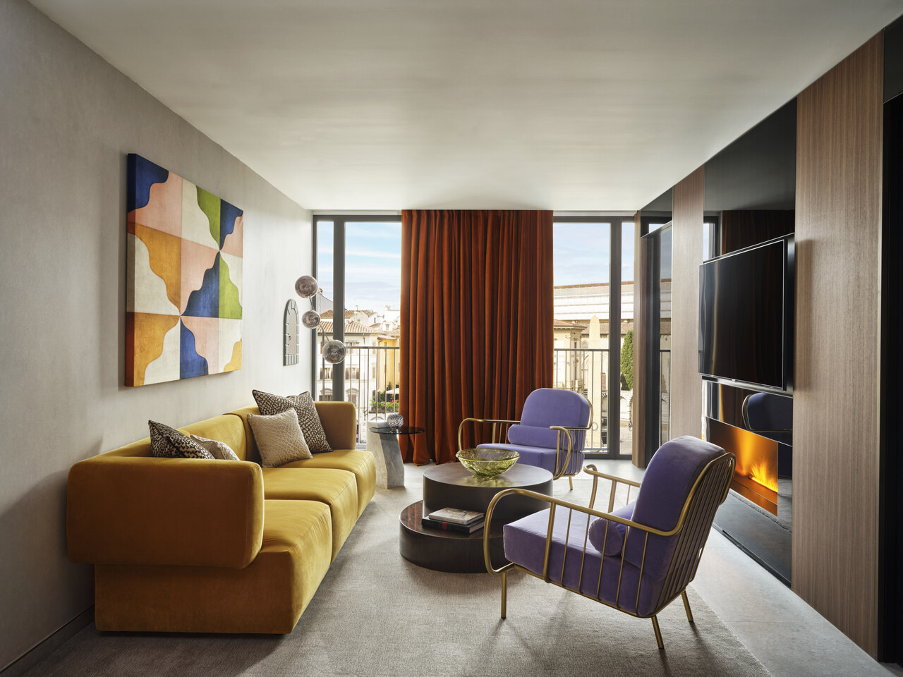 Die 119 Zimmer und Suiten – darunter ein spektakuläres Penthouse mit 140 Quadratmeter großer Terrasse – beeindrucken mit geometrischen Formen, satten Farbakzenten in Medici-Rot, königlichem Blau und lebhaftem Grün sowie maßgefertigten Lichtinstallationen, die an die Bögen der Florentiner Renaissance-Architektur erinnern.